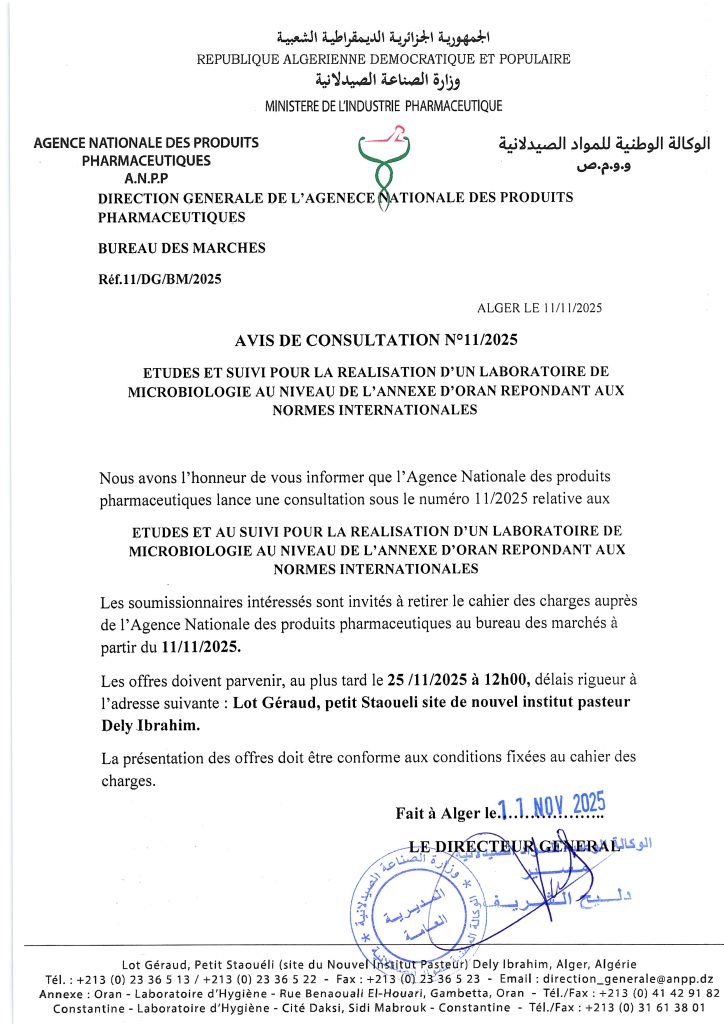 Avis de Consultation N°11/2025: Etudes et suivi pour la réalisation d’un laboratoire de microbiologie au niveau de l’annexe régionale d’Oran répondant aux normes internationales