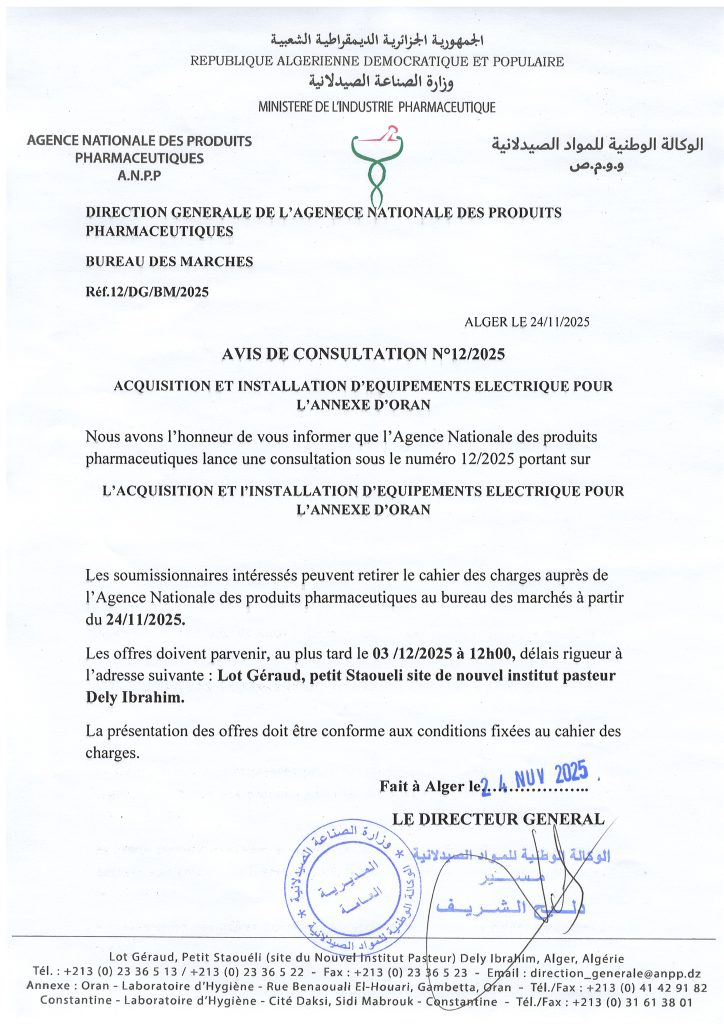 Avis de Consultation N°12/2025: Acquisition et Installation d’Equipements Electrique pour l’Annexe Régionale d’Oran.